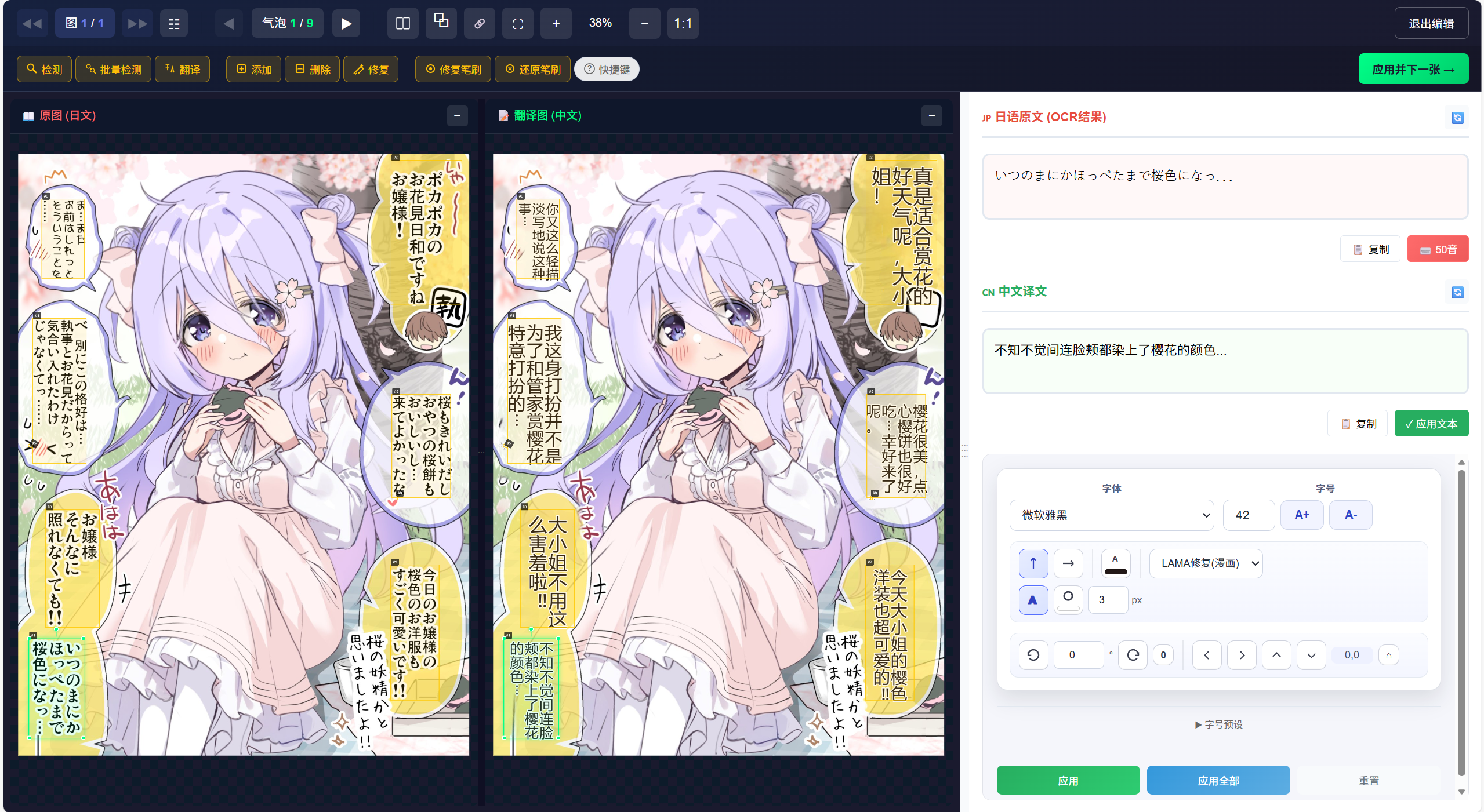 | 修复 | 对选中气泡进行背景修复(LAMA 或纯色) |